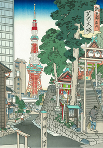 『Tokio山水』は、東京山手線内の範囲を江戸期から現在に至る建造物を取混ぜて描く。三越の三作は景観年代を逆に積み上げ、百貨店の上に越後屋が乗る形で表し人々が入混ぢる。『新東都名所シリーズ』は、東京のランドマークを土地・建物の成立ちを反映させた仮想の建造物として描く。