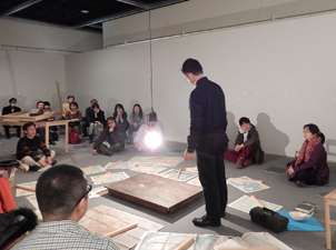 「発信展」出品作家・丸山常生さんのパフォーマンスが、展示作品の中で行われました。カタカタ・・・と小刻みに震えるような音が遠くから聞こえ、小さな椅子をのせた小皿を持った常生さんが扉の中から登場。緊張感の漂う雰囲気と共に始まりました。終了後、言葉ではうまく表せませんが、時間の流れや儚いものを感じました。見る人それぞれの感じ方があるのではないかと思います。ご覧になった方、いかがでしたか?このパフォーマンスは3回シリーズとなっています。次回は、12月22日(日曜日)に開催されます。ぜひご覧ください。(約40名)