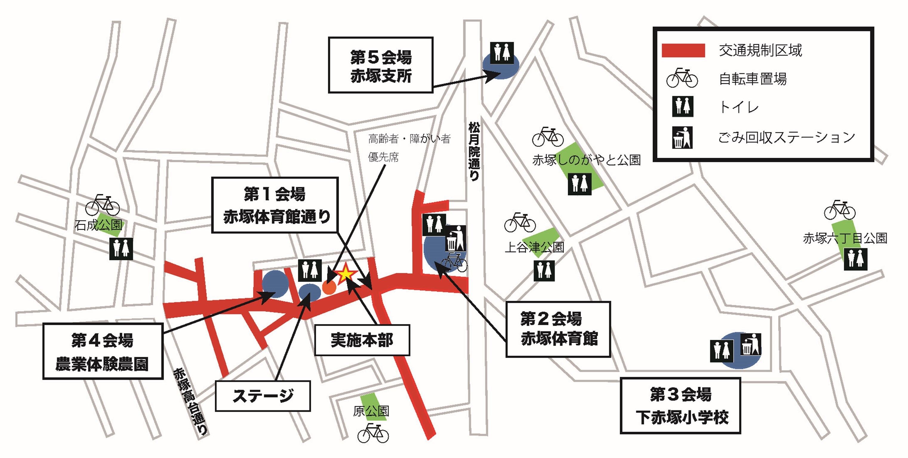 注:例年、会場として使用していた赤塚小学校は長寿命化工事により使用できないため、赤塚小学校で実施していた催し物は、下赤塚小学校・赤塚庁舎で実施します。 - 会場図