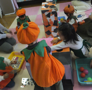 みんなでハロウィンのダンスや手遊びを行ったほか、館内に隠されたハロウィンアイテムを探して集めました。