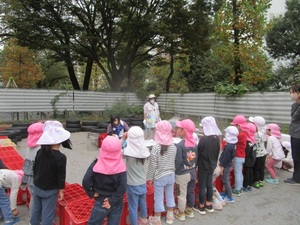 11月初旬のお楽しみ会当日、園庭では焼きいものいい匂い。子どもたちも出来上がりを楽しみにしながら見ています。